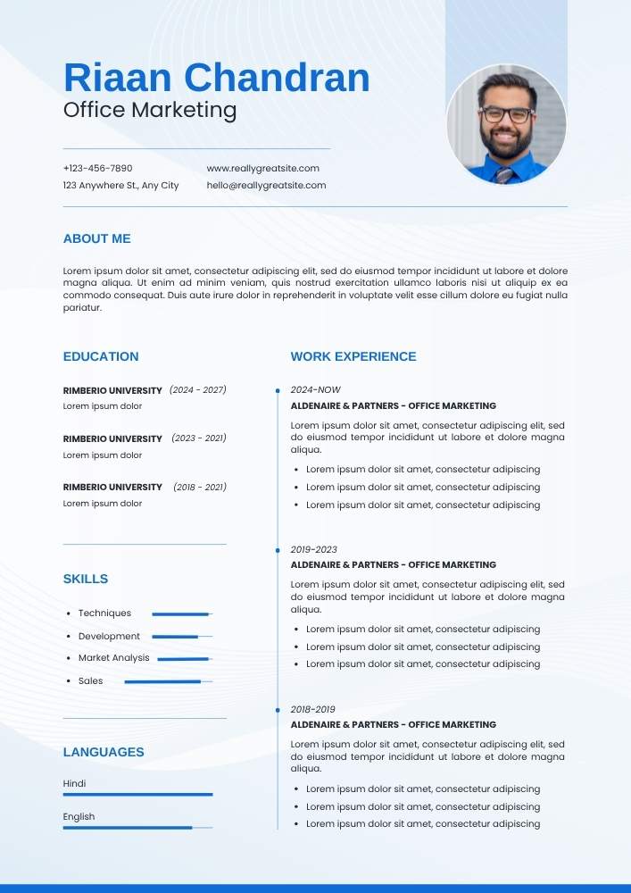 This resume template is ideal for professionals in business, marketing, administration, IT, or creative industries. The clean layout organizes information under distinct headings — profile, experience, education, skills, and contact details — ensuring your resume looks structured and balanced. The soft blue tones convey reliability and calm professionalism, while the white background enhances readability and aesthetic appeal.