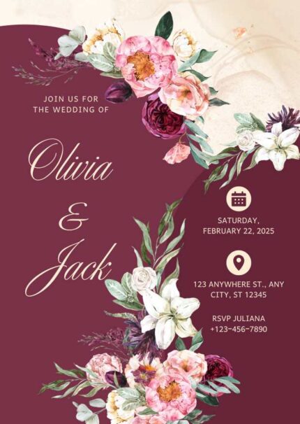 Burgundy Elegant Garden Flowers Watercolor Wedding Invitation | Editable Canva Template | Wedding & Anniversary Card