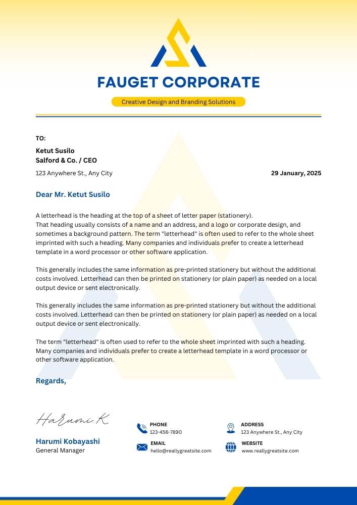 Give your business communication a bold, professional, and highly modern identity with this Yellow and Blue Modern Corporate Letterhead A4 Template, fully editable in Canva. Designed for corporate companies, consultancy firms, financial agencies, marketing teams, real estate businesses, HR departments, startups, and service-based organizations, this letterhead delivers a clean layout with strong visual impact.